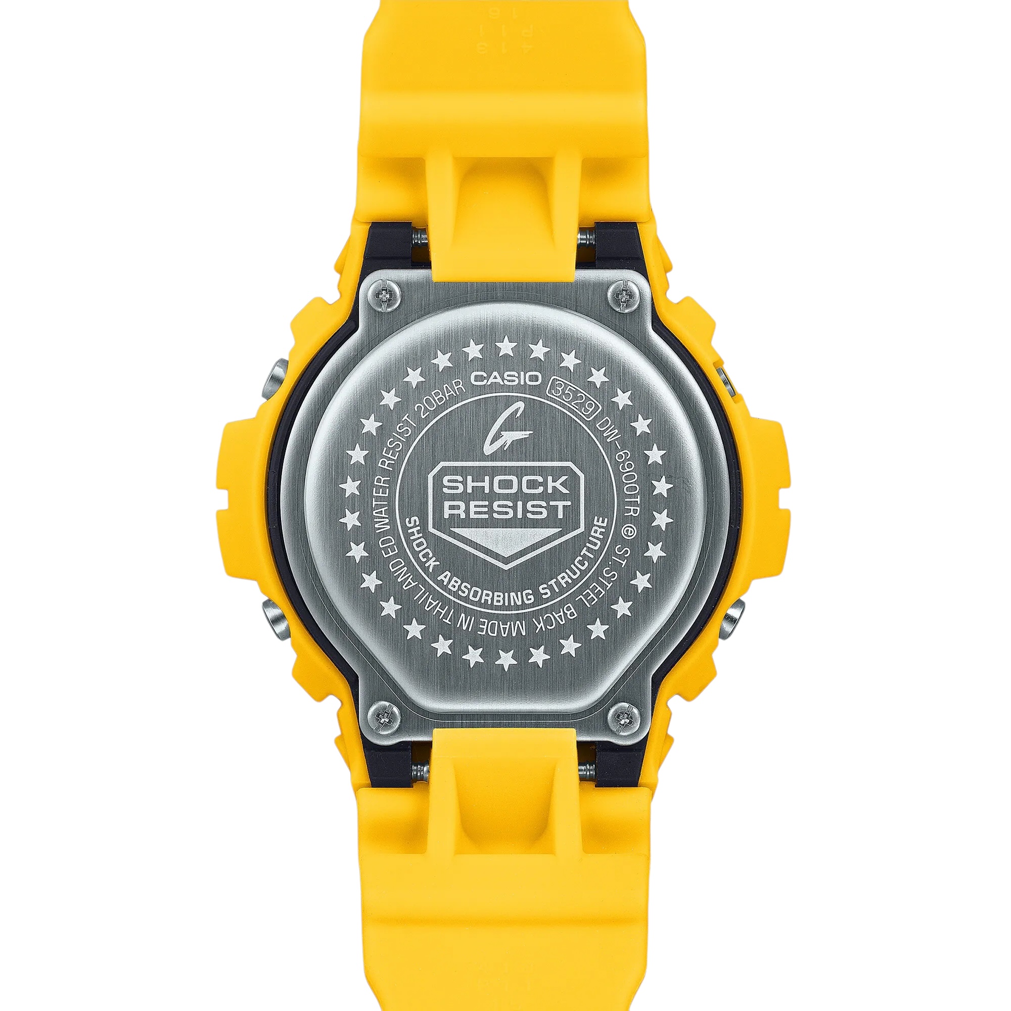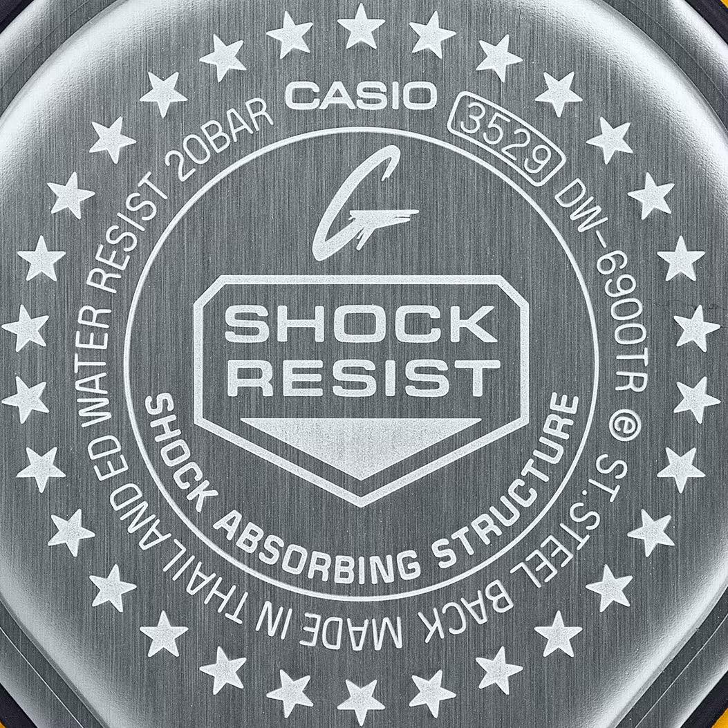 la icónica línea 6900 de G-SHOCK. La DW-6900TR, rinde homenaje a la evolución de la linea desde 1995. Destacamos el emblemático botón frontal del 6900, ahora metálico, con la marca «»G»» grabada en la superficie con acabado espejo, aportando una poderosa sensación de presencia en el centro de la clásica forma redonda. Al pulsar el botón de la luz, aparecerán las palabras «»DESDE 1995″» en la pantalla LCD. El logotipo «»SHOCK RESIST»» grabado en el fondo de la caja está rodeado por 30 estrellas que conmemoran los 30 años de la línea 6900. Los componentes principales de la caja, la correa y otros elementos están fabricados con resina de base biológica, un material que ayuda a reducir el impacto ambiental. El embalaje especial incluye el símbolo «»G»», un guiño al diseño utilizado para la DW-6900H. Cada reloj se presenta en un envase exclusivo que incorpora uno de los tres colores disponibles: rojo, amarillo o negro. Todos estos detalles se combinan en un diseño único, perfecto para celebrar el 30º aniversario de la línea 6900 de G-SHOCK.