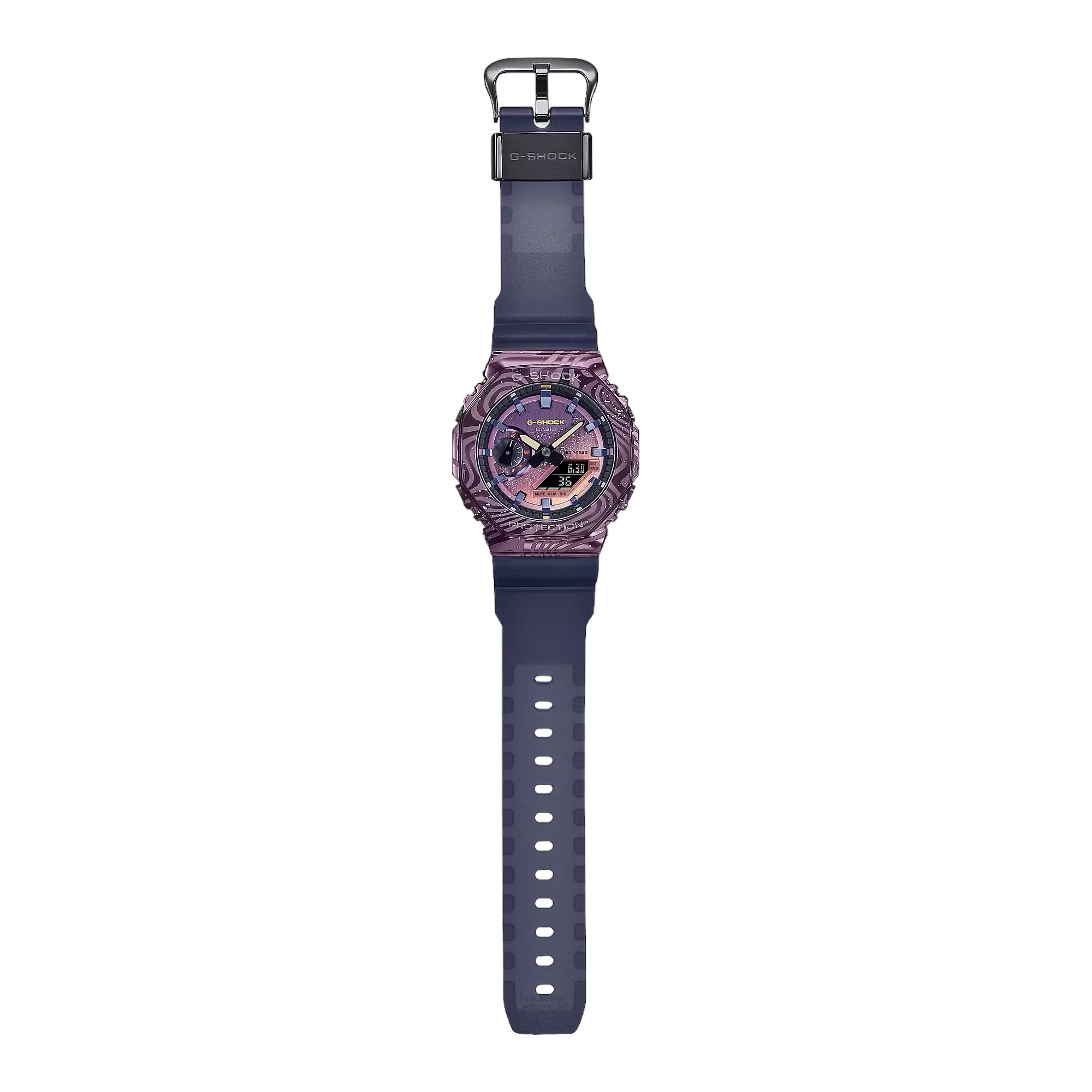 Recorre la Vía Láctea con un G-SHOCK muy especial cubierto de metal. Esta edición limitada se basa en el GM-2100 y recrea su icónico bisel octogonal en metal morado con revestimiento iónico, con un motivo de la galaxia impreso con láser. La esfera cuenta con una gradación de color en un acabado por deposición de vapor, que evoca la Vía Láctea brillando en el cielo nocturno. La correa recuerda la imagen del cielo nocturno, con su profundidad capturada gracias a una correa traslúcida mate en resina azul marino. El reverso de la caja cuenta con revestimiento iónico en negro y un diseño grabado con láser inspirado en la Vía Láctea. Todos estos detalles se unen en un diseño impresionante que lleva el impacto del cosmos a su muñeca en elegantes colores morado, negro y azul marino, para que puedas usarlo en una multitud de ocasiones. Viene en un packaging especial con un diseño de la Vía Láctea, por lo que sería el regalo perfecto para alguna de tus personas más importantes.