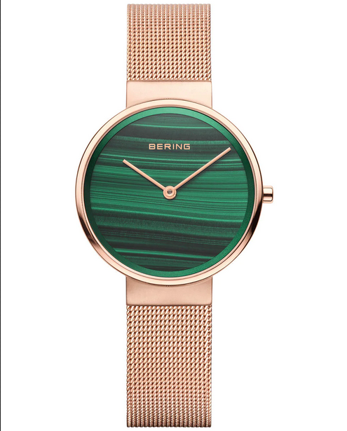 Reloj Classic, caja de acero inoxidable pavonado en oro rosa de 31mm, esfera verde texturizada con efecto piedra malaquita, brazalete de malla milanesa pavonada en oro rosa