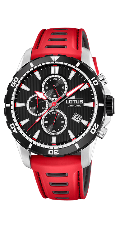 Lotus caballero acero, esfera negra con indices y manecillas en blanco y rojo con luminiscentes, crono de 3 esferas , segundos, minutos y horas, ventana de calendario a las 4, correa de caucho en rojo con pespunte negro y cierre de hebilla, sumergible 5atm, 2 años de garantía y estuche