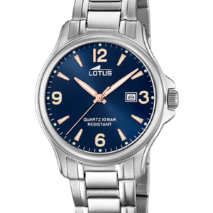Lotus mujer en acero, caja de acero con cristal mineral y 3 agujas, esfera en tono cobre, correa de eslabones con cierre de seguridad desplegable, sumergible 5atm, 2 años de garantía y estuche