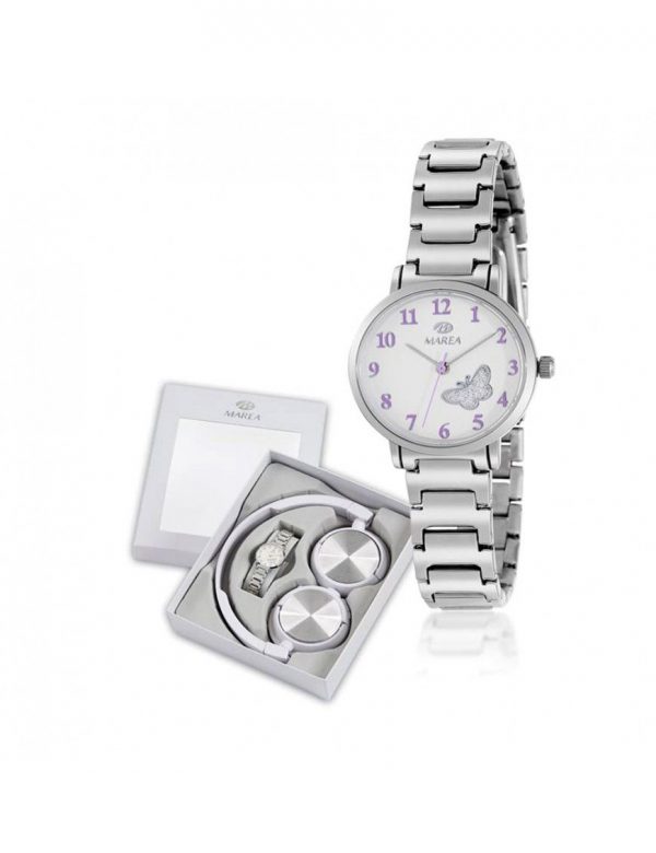 Reloj Marea Niña + Auriculares B41248/11, analógico con segundero. Caja de 27mm de diámetro. Esfera decorada con mariposa en su interior. Pulsera de acero y cristal mineral. Sumergible a 3ATM, por lo que sólo soporta pequeñas salpicaduras. Auriculares inalámbricos de regalo.