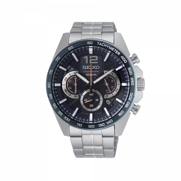 Reloj Seiko Caballero calibre 8t63 de 45,2mm,caja de acero con taquimetro en azul yy detalles en naranja , cristal hardlex, cronografo, esfera en azul con detalles en naranja, fondo de caja a rosca, sumergible 10atm, 2 años de garantía, estuche Seiko .
