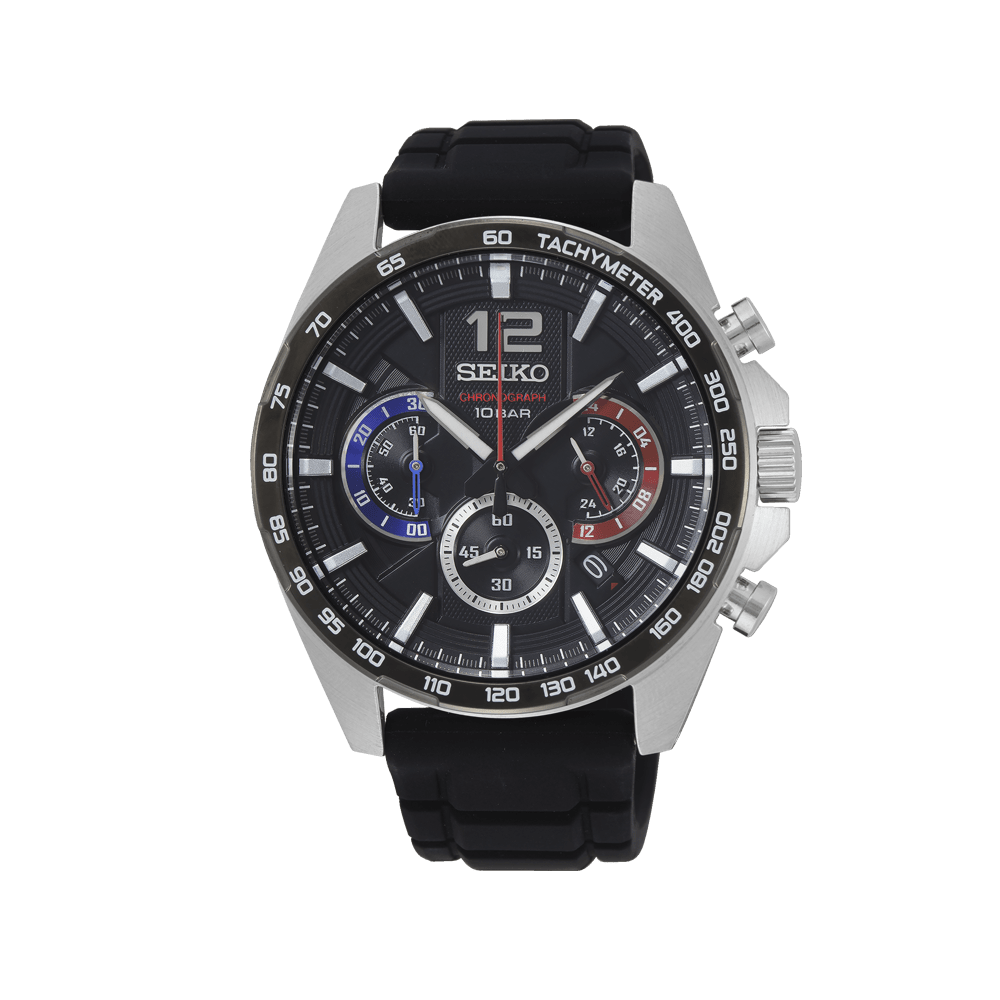 Reloj Seiko Caballerocalibre 8t63 de 45,2mm,caja de acero con taquimetro en negro, cristal hardlex, cronografo, esfera en negro con esferas interiores en rojo y azul y manecilla de segundero en rojo, fondo de caja a rosca, sumergible 10atm, 2 años de garantía, estuche Seiko .