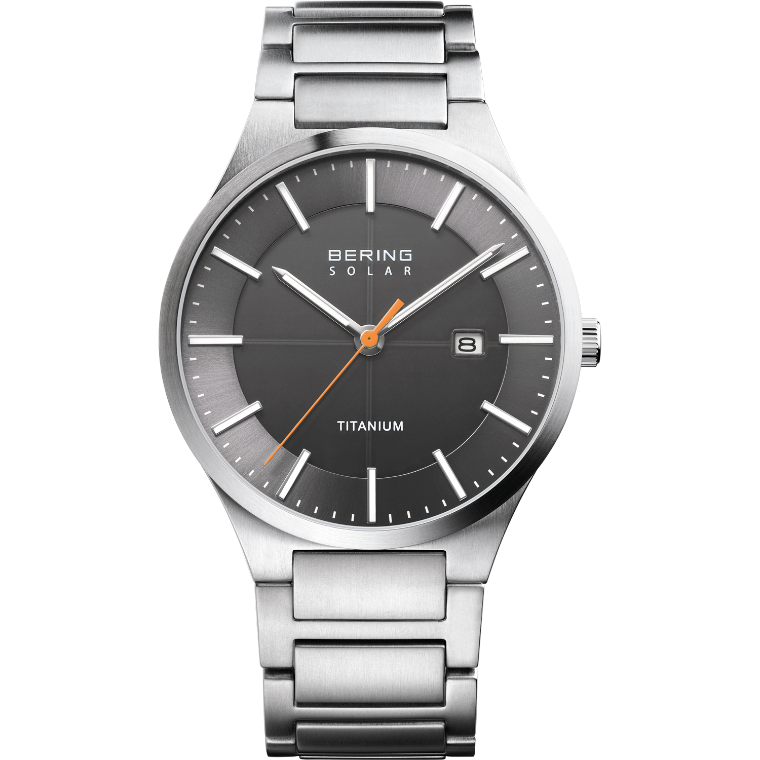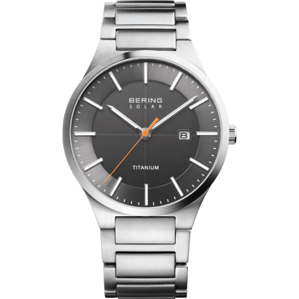 Reloj de hombre con brazalete en titanio y caja titanio de 39 mm, lo que le confiere gran resistencia y muy poco peso. Movimiento de cuarzo solar, cristal de zafiro, esfera en gris e indices en blanco, agujas luminiscentes y aguja de segundero en naranja, calendario a alas 3 y sumergible 5atm